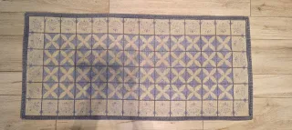 Tappeto con un design geometrico che combina tonalità bianca e blu. Aggiunge un tocco di stile a qualsiasi ambiente. Come mostrato in foto presenta 2 piccoli fori e un orlo del lato corto è stato ricucito ma ciò non compromette la bellezza dell'articolo. Misure: 125x58 cm. - Motivo a rombi e quadrati. - Bordatura decorativa.