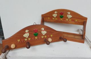 Graziosa combinazione di portaspezie in legno e appendi asciugamani/strofinacci,perfetti per aggiungere un tocco di colore e allegria alla cucina. - Decorato con simpatiche paperelle e tulipani. - Motivo a cuoricini lungo la base della decorazione -portaspezie cm 29.5x7x19; appendi strofinacci cm 34x2x13 - marca Montemaggi (Signa,Firenze)