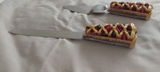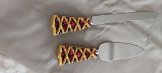 Set di posate per tagliare la torta, con manici decorati. Set coltello e paletta per dolci con manico a forma di fetta di crostata - Manici con design a intreccio e decorazioni. - Lame in metallo.
