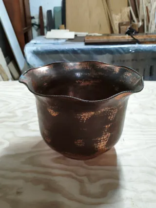 Elegante cachepot in rame, con una finitura che esalta la lavorazione artigianale. Il bordo ondulato aggiunge un tocco di stile unico, DA PULIRE. - Materiale: Rame - Colore: Marrone e oro - Bordo lavorato a mano