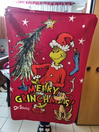 Coperta in pile con il Grinch e il suo cane Max. Perfetta per le festività. - Misure: 100x150 cm - Design natalizio con il Grinch - Morbida e calda al tatto