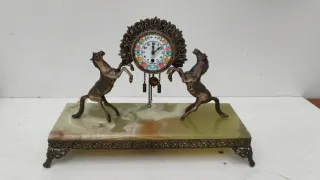 Elegante orologio da camino antico, un pezzo unico per arredare la tua casa. Lunghezza 28 cm, larghezza 12 cm - Base in onice con venature verdi. - Decorazioni in metallo con due cavalli rampanti. - Cornice decorata attorno al quadrante.