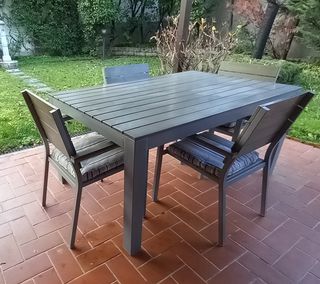 Tavolo Ikea grigio 99,5×160 cm h 76cm con gambe in alluminio e piano in pvc, più 4 sedie abbinate, impilabili. Ogni sedia ha ingombro max 49,5×60×86cm, è dotata di braccioli e cuscini quadrati con fodera lavabile a cerniera 40×40cm. Il piano del tavolo presenta alcune irregolarità e macchie dovute all'usura, si potrebbe rendere più uniforme con una mano di vernice. I difetti sono visibili nelle ultime foto, sono puramente estetici perché strutturalmente è perfetto. Le gambe si possono smontare per il trasporto. Le sedie sono in ottimo stato. Ritiro a mano a Cernusco sul Naviglio.