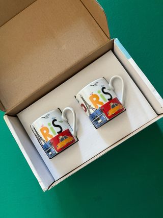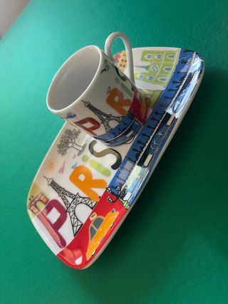 Elegante set da tazzine da caffè francesi con piattino, perfetto per gustare un espresso. MAI USATE - Design ispirato a Parigi con iconici monumenti e taxi. - Realizzato in porcellana di alta qualità. - Colori vivaci e dettagli curati.