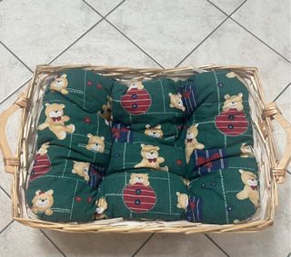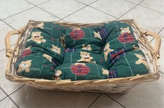 Cesto in vimini con cuscino imbottito, ideale per il riposo del tuo gatto. Il cuscino presenta una fantasia con orsetti e bottoni. - Cesto in vimini intrecciato. - Cuscino morbido e confortevole. - Fantasia con orsetti e dettagli a quadri. Dimensioni massimo ingombro cm. 40 x 37 altezza cm. 18 circa dimensioni interne cm. 49 × 34. 🎁 con l'acquisto un omaggio per te!! #cucciananna #cucciagatto #materassogatti #cuscinoimbottito