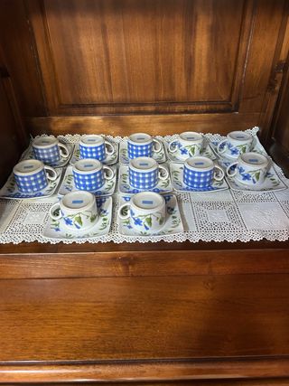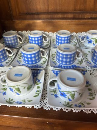 Elegante set di 12 tazzine da caffè con piattino abbinato, perfette per gustare un espresso. - Design a quadretti blu e bianchi. - Decorazione floreale delicata sui piattini. - Realizzate in porcellana di alta qualità.