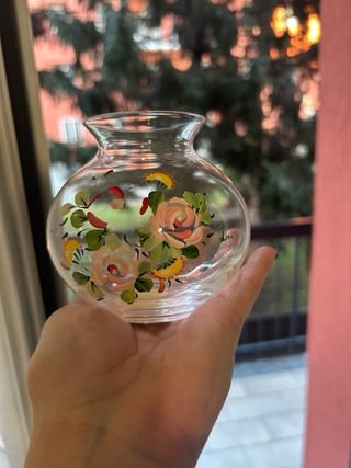 Delizioso set di tre vasi in vetro, ognuno decorato con dipinti floreali a mano.