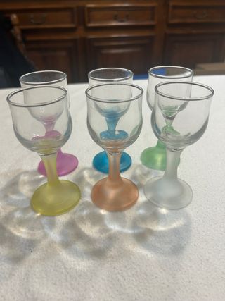 Set di sei bicchierini con stelo e base colorata, perfetti per liquori o shot.
