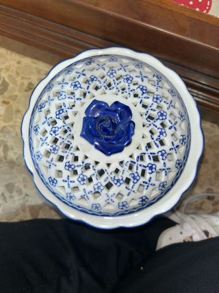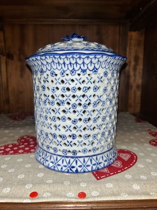 Elegante biscottiera in porcellana con un delicato motivo floreale. - Decorazione a fiori blu su fondo bianco. - Design traforato con coperchio. - Base decorata con motivi geometrici.