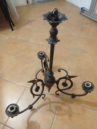 Lampadario della fine anni 60 in stile antico. - Struttura in metallo finemente lavorato. - Dettagli decorativi in rilievo. - Tre portalampade con attacco E27 - Una parte è danneggiata, come chiaramente visibile in foto. - L'impianto elettrico è assente, deve essere ripristinato. - il metallo necessita di essere pulito e lucidato.
