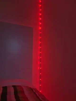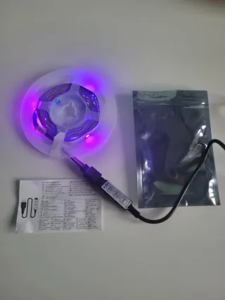 Striscia LED RGB lunga 5 metri, mai usata, con 20 colori diversi e 8 livelli di luminosità. Include modalità "scatto colori" per passaggi automatici tra i colori. Alimentatore con pulsanti integrati incluso, cavo di alimentazione lungo 45 cm. Retro adesivo per fissaggio facile al muro. Funziona a 5V ed è pronta per essere montata e accesa subito.