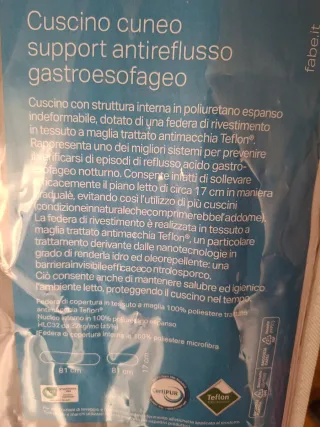 Cuscino a cuneo per il supporto antireflusso gastroesofageo. La federa è trattata antimacchia Teflon®. - Struttura interna in poliuretano espanso indeformabile. - Federa di rivestimento in tessuto a maglia trattato antimacchia Teflon®. - Trattamento idro ed oleorepellente. - Dimensioni: 81 cm x 81 cm x 17 cm.