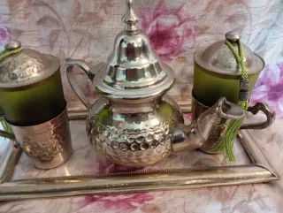 Elegante servizio da tè composto da teiera e due tazze. - Teiera in metallo lavorato. - Due tazze con finitura martellata. - Dettagli in corda verde con nappe.