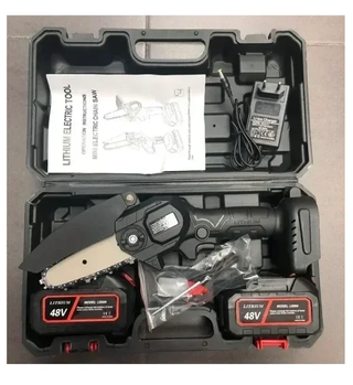 Mini motosega elettrica a batteria da 48V, ideale per lavori di potatura. - Include 2 batterie al litio da 48V. - Caricabatterie incluso. - Manuale di istruzioni. - Custodia rigida per il trasporto.