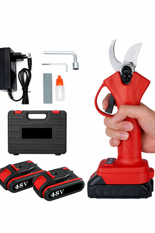 Set di forbici elettriche per potatura da giardino, ideali per la cura di piante e rami. - Include due batterie al litio da 48V. - Caricabatterie incluso. - Valigetta rigida per trasporto e conservazione. - Manuale di istruzioni.