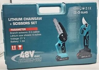 Set per il giardinaggio composto da forbice elettrica e motosega a catena, entrambi alimentati a batteria. Include due batterie da 48VF e caricabatterie. - Forbice per potatura rami. - Motosega a catena con lama da 6 pollici. - Due batterie ricaricabili incluse. - Caricabatterie. - Accessori per la manutenzione.
