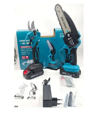 Kit per potatura da giardinaggio con forbici e motosega. - Colore: turchese e nero. - Voltaggio batteria: 48V. - Capacità batteria: 1.5A. - Barra motosega da 6 pollici.
