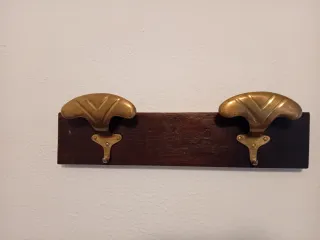 Elegante attaccapanni vintage con base in legno scuro e ganci in ottone. - Design raffinato con dettagli incisi sull'ottone. - Base in legno massello.