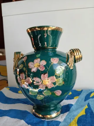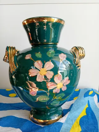 Elegante vaso in porcellana con decorazioni floreali. Presenta segni di usura ma non è rotto o spaccato .vaso vintage '70 - Finitura lucida. - Dettagli in oro. - Motivo floreale rosa e oro.
