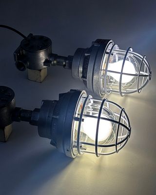 Coppia di lampade da soffitto industriali vintage, mod. EVA 3010 prodotte dalla CEI (Crouse Hinds of Europe - Italy) nel 1976. Sono due luci antideflagrazione composte da un corpo in alluminio pressofuso, un paralume a cupolo in vetro e una gabbia di protezione, completate sulla parte superiore da una scatola di derivazione anch'essa in alluminio pressofuso. In ottime condizioni e perfettamente funzionanti presentano piccoli segni del tempo, l'impianto è stato ricondizionato secondo le caratteristiche originali, montano lampadine (comprese) con attacco E27.