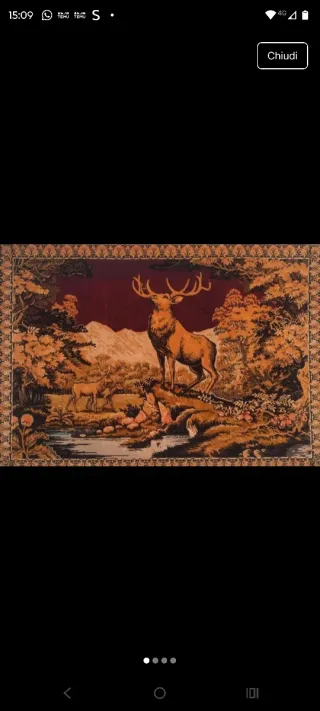 Tappeto decorativo con una scena di natura e animali. - Raffigura un cervo maestoso in primo piano. - Presenta una foresta lussureggiante con alberi e un ruscello. - Dettagli intricati e colori vivaci. - Con frangia. - Misure 186 * 137,5 cm.