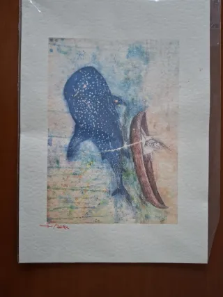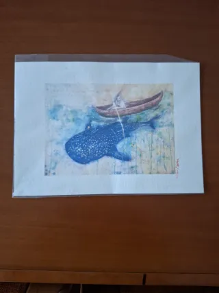 Bellissimo acquerello originale raffigurante una scena marina con una balena e una barca. - Tecnica mista su carta. - Colori vivaci e dettagli curati.