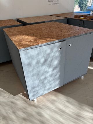 Mobile quadrato bifacciale con ruote. - Struttura in legno. - Finitura esterna grigia. - Piano in materiale composito effetto legno.