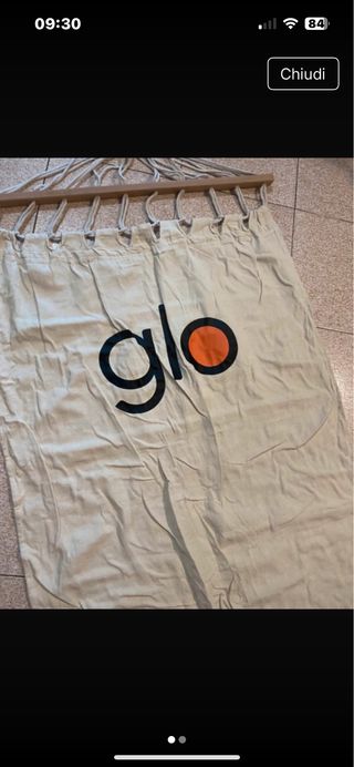 Amaca comoda e resistente, perfetta per rilassarsi all'aperto. - Struttura in legno. - Tessuto color beige con logo arancione. Glo più omaggio una Glo imballata