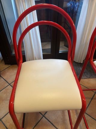 Coppia di sgabelli dal design moderno e accattivante. - Struttura in metallo verniciato di rosso. - Seduta imbottita in similpelle bianca.