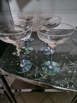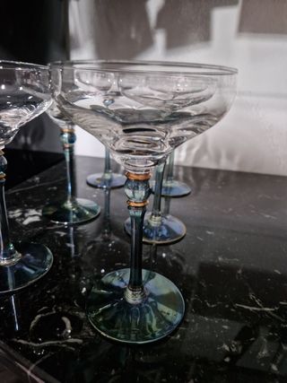Elegante servizio di 6 calici in cristallo,piombo 24% perfetti per ogni occasione speciale, belli ed eleganti, stelo verde MAI utilizzati - Design raffinato con stelo colorato. - Bicchieri trasparenti con riflessi verdi.
