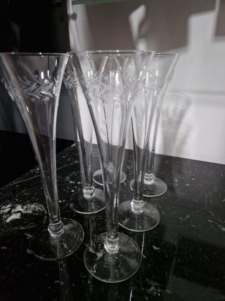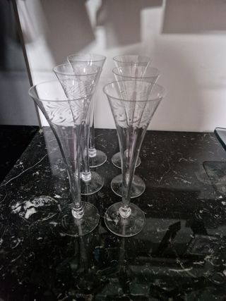 Elegante set di sei flute in cristallo, perfetti per celebrare momenti speciali. Presentano un delicato motivo inciso che aggiunge un tocco di raffinatezza. - Set da 6 bicchieri. - Design slanciato e classico. - Incisioni floreali sulla coppa.