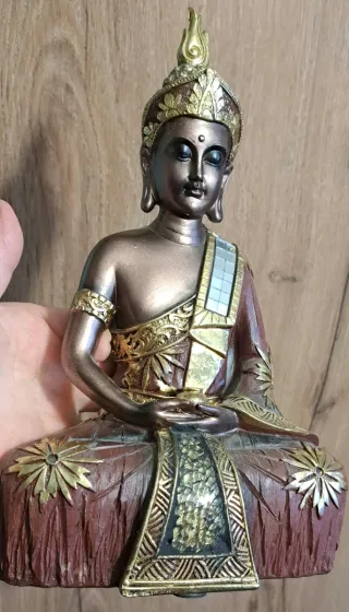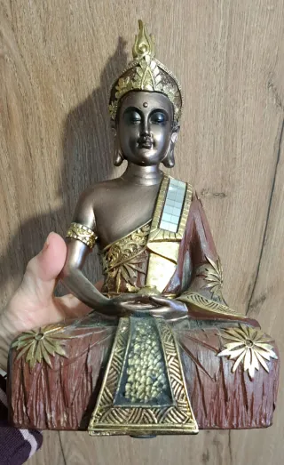 Statua decorativa di Buddha seduto, con dettagli in oro. - Finitura anticata. - Dettagli floreali. - Posizione meditativa. Misure in fotografia nuovo non usato