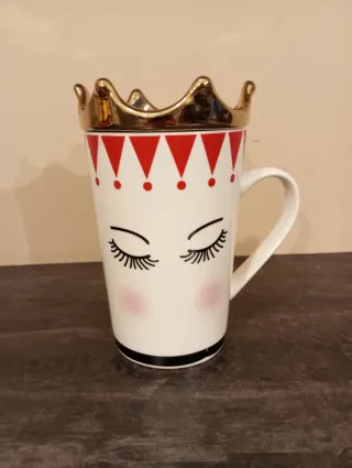 Tazza in ceramica con un design unico. - Coperchio a forma di corona dorata. - Decorazione con occhi stilizzati e guance rosse. - Motivo a triangoli rossi e pois sulla parte superiore.