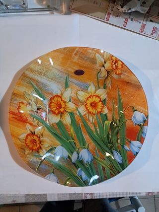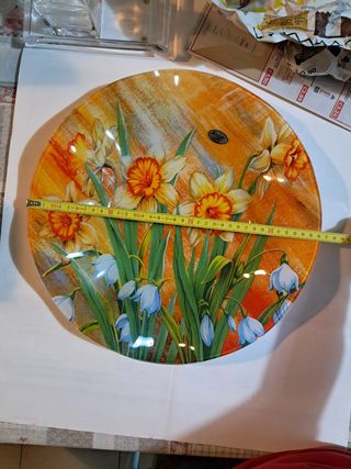 Centrotavola o vassoio in vetro decorato con un motivo floreale. - Design con narcisi e campanule. - Sfondo sfumato arancione e giallo. centrotavola vassoio piatto in vetro allefors narcisi diametro 36 cm