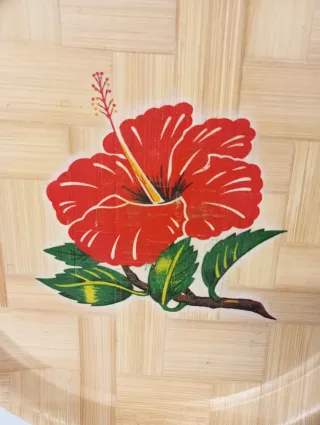 Vassoio rotondo con un bellissimo disegno di un fiore rosso e foglie verdi. - Design intrecciato che ricorda il bambù. - Colori vivaci e dettagli curati. Dimensioni 32,5
