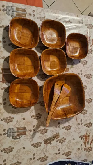 Set di insalatiera in legno, perfette per servire le tue pietanze con stile. Il design intrecciato aggiunge un tocco rustico alla tavola. Set completo di 9 pezzi: 1 insalatiera, 6 coppe, una forchetta e un cucchiaio. Mai usato.