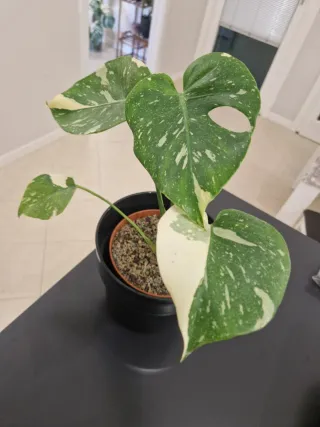 Splendida Monstera Thai Constellation, conosciuta anche come Crème Brûlée. Questa pianta è apprezzata per le sue foglie uniche. - Foglie con variegatura bianca e verde. - Pianta in vaso da 12 cm. Pianta ben radicate e con foglie belle e sane