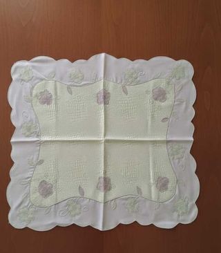 Elegante centro da tavola con un motivo floreale e una texture che ricorda la pelle di coccodrillo. Le sue dimensioni sono 84 x 84 cm. - Design con fiori stilizzati. - Bordi smerlati decorativi. - Texture a rilievo al centro.