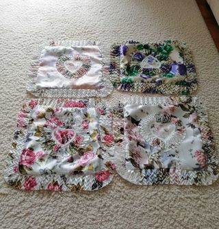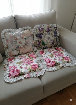 Set di quattro cuscini decorativi con un design floreale e bordi in rilievo - Fantasia floreale con rose. - Dettagli a cuore sul davanti. - Bordi della stessa stoffa simile a raso Con cerniera non funzionante Ma si possono usare cucendo la stoffa