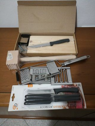 Set di utensili da cucina completo per diverse preparazioni. Comprende - Tagliere in legno - Batticarne in legno di faggio nuovo - Grattugia multiuso acciaio - Coltello da bistecca con lama seghettata - Set di 6 coltelli da bistecca con manici neri nuovi