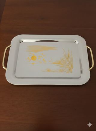 Elegante vassoio in acciaio inox 18/10 con manici dorati. Presenta un'originale decorazione con un paesaggio stilizzato al tramonto. - Materiale: Acciaio Inox 18/10 - Colore: Argento e Oro - Design: Paesaggio al tramonto