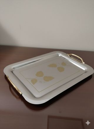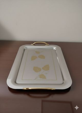Elegante vassoio in acciaio inox 18/10 con un raffinato motivo floreale dorato. - Design moderno con manici dorati. - Superficie interna decorata con foglie stilizzate. - Bordo rialzato per una maggiore praticità. Nuovo mai usato sempre stato in vetrina