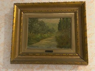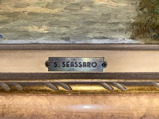 Dipinto paesaggistico di Seassaro con una strada che serpeggia tra alberi e colline. - Cornice in legno dorato. - Firma dell'artista visibile in basso a sinistra. - Targa metallica con nome SEASSARO sotto il dipinto.
