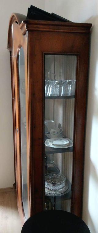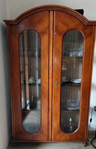 Elegante vetrinetta d'arredo con finiture in legno e dettagli in vetro. - Design curvo superiore. - Ante con pannelli in vetro. - Ripiani interni per esposizione.