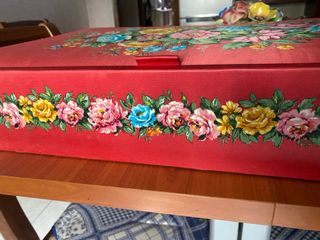 Elegante contenitore rosso con decorazioni floreali sul bordo. Ideale per conservare oggetti. Rivestimento interno ed esterno in tessuto. Bordi decorati con fiori colorati.