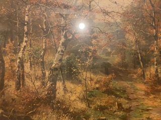 Bellissimo quadro raffigurante un paesaggio autunnale con alberi e un sentiero.Dipinto ad olio su tela. - Realismo paesaggistico di fine XIX o inizio XX secolo. L'autore è Adolf Thamm (1859–1925), un pittore tedesco noto per i suoi paesaggi realistici e le atmosfere boschiveCornice in legno inclusa.