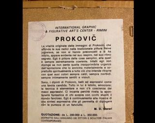 Bellissimo quadretto con un'opera di Prokovic, che affonda le sue radici nella tradizionale pittura Naive jugoslava. Un pezzo unico che cattura l'essenza dell'arte. - Tecnica espressiva e colori caldi. - Rappresentazione di cose semplici con grande coerenza. - Sintesi espressiva che richiama la purezza di un fanciullo. - Quotazione: da L. 200.000 a L. 350.000. - Estratto dall'annuario dei pittori e scultori italiani contemporanei.