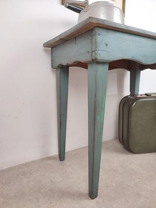 Questo tavolo in legno di castagno era in pessime condizioni, praticamente tutte le sue parti erano allentate, piene di buchi dovuti a vecchi chiodi, ecc. Dopo averlo smontato completamente, levigato e ridipinto imitandone il colore e la patina originali, si è affermato in modo tale che, oltre ad essere molto versatile, è unico e adatto a una moltitudine di ambienti.