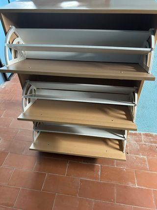 Mobile scarpiera con un design moderno e funzionale. - Finitura in bianco e legno. - Due ampi scomparti. Piccolo difetto visibile nell'ultima foto che non influisce sulla funzionalità della scarpiera.