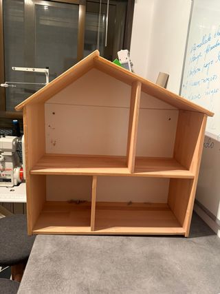 Scaffale in legno con un design unico a forma di casa, ideale per l'organizzazione. - Struttura in legno chiaro. - Finitura bianca sul retro.